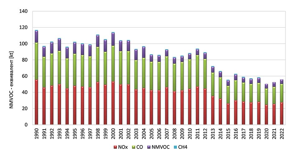 Емисиите на прекурсорите на озон во 2022 година во однос на 1990 година се намалени кај азотните оксиди (NOX) за 46%, кај неметанските испарливи органски соединенија (NMVOC) за 53%, јаглерод моноксид (CO) за 63%, а кај метанот (CH4) во однос на 2019 година се забележува пад за 5%.