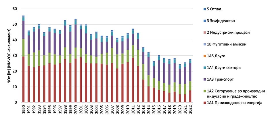 Главен извор на емисии на NOx во 2022 година е NFR категоријата 1.А.3 - Транспорт со удел од 42%, по што следуваат категориите 1.А.1 Производство на енергија и 1.А.2 - Согорување од производни индустрии и градежништво со удели од 28% и 21%, соодветно. NFR категоријата 1.А.4 - Други сектори (домаќинства, комерцијален, административен) во вкупните емисии на азотни оксиди учествува со удел од6%, додека останатите категории имаат помал или незначителен удел во вкупните емисии на азотни оксиди.