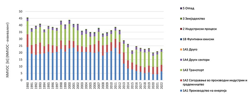 Главен извор на емисии на NMVOCs во 2022 година е NFR категоријата 2 Индустриски процеси со удел од 36%, по што следуваат NFR категориите 1.B - Фугитивни емисии од горива и 1.А.4 Други сектори (домаќинства, комерцијален, административен), со по 21%, додека категориите 3 – Земјоделство, 1.А.3 Транспорт и .А.2 - Согорување во производни индустрии и градежништво учествуваат со удели во вкупните емисии на NMVOCs 13%, 5% и 2%. , и и од. Останатите категории имаат помал удел во вкупните емисии на овие загадувачки супстанции во 2022 година.