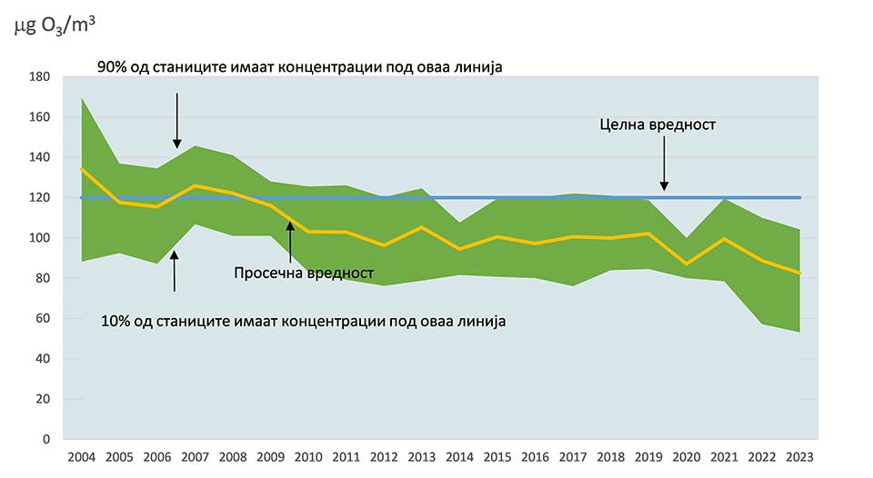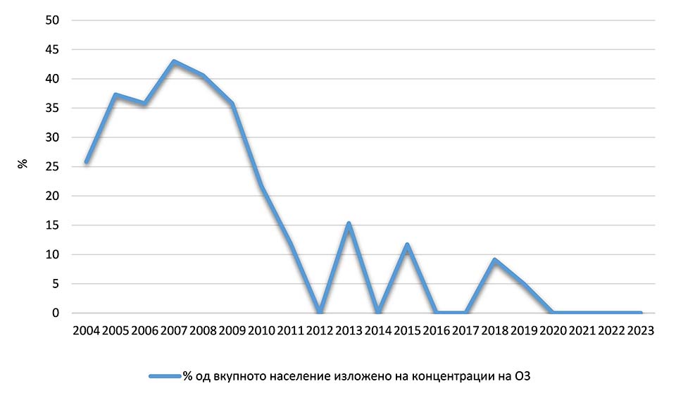 Во периодот од 2004 до 2023 година од 0 до 43 % од населението било изложено на концентрации на озон кои ја надминуваат целната вредност за заштита на човековото здравје. Највисок процент на изложеност на населението има во 2007 година со изложеност од 43 %.
