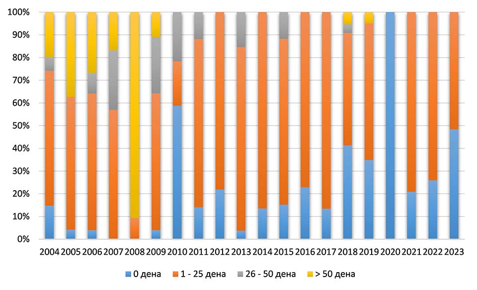 Графикон 2: Процент од урбаната популација изложена на концентрации на O3 над долгорочната целна вредност за заштита на човеково здравје, изразена како број на денови во текот на една календарска година
