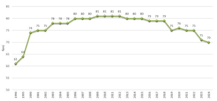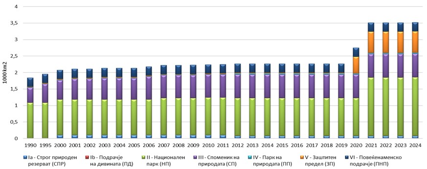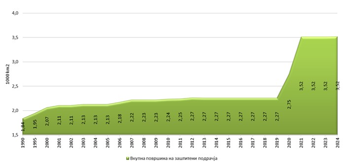 Трендот на зголемување на вкупната површина на заштитените подрачја во км2 во периодот од 1990 до 2024 година е прикажан на график 2. Во 2024 година регистрирана е промена во трендот и зголемување на вкупната површина на заштитените подрачја на национално ниво.