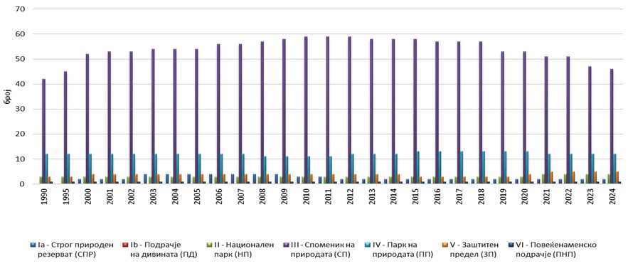 Трендот во прогласување на заштитените подрачја е прикажан на графиконот 1. Во текот на годините се забележува зголемување на бројот на заштитени подрачја. Денес, вкупниот број на заштитени подрачја е 70 и истиот е намален заради спроведена постапка за репрогласување на поединечни стебла или помали локалитети кои биле прогласени како споменици на природата, а со измените на Законот за заштита на природа, истите се репрогласени како природни реткости. Вкупниот број на природни реткости до денес изнесува 27. Најголем број подрачја припаѓаат на категоријата споменик на природата (44), потоа следи категоријата парк на природата со 12 подрачја.