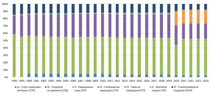 - Процентуална застапеност на поединечните категории на заштитени подрачја од вкупната територија на државата.