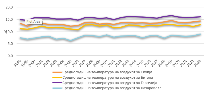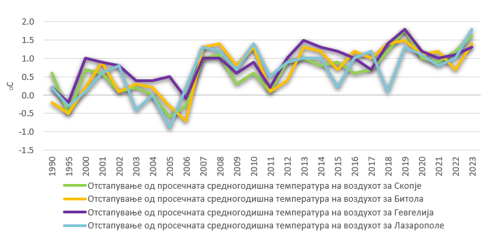 Во разгледуваниот период може да се забележи покачување на средногодишната температура на воздухот во сите четири разгледувани населени места, односно позитивно отстапување од просечната средногодишна температура на воздухот. Отстапувањето од средногодишната температура на воздухот за периодот од 1981 до 2010 година, за Скопје се движи помеѓу -0,6°C и 1,8°C, за Битола се движи помеѓу -0,7°C и 1,5°C, за Гевгелија помеѓу -0,2°C и 1,8°C и за Маврово помеѓу -0,9°C и 1,8°C.