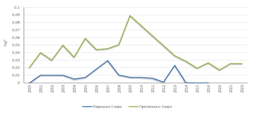 Просечните годишни концентрации на нитрати и ортофосфати се релативно стабилни уште од почетокот на деведесеттите години на минатиот век. Утврдено е дека концентрацијата на овие параметри е во рамките на пропишаните вредности во националните прописи. Следењето на резултатите од мерењата во пелагиските делови на Охридското Езеро за време на целиот период го задржува олиготрофниот карактер со релативно стабилни концентрации на фосфор (под 0,015 mg/l), поголема концентрација на фосфор (0,030 mg/l) е забележена во 2007 година на Охридското езеро и концентрации на нитрати во рамките на дозволените граници (просечни годишни концентрации под 0,55 mg/l).