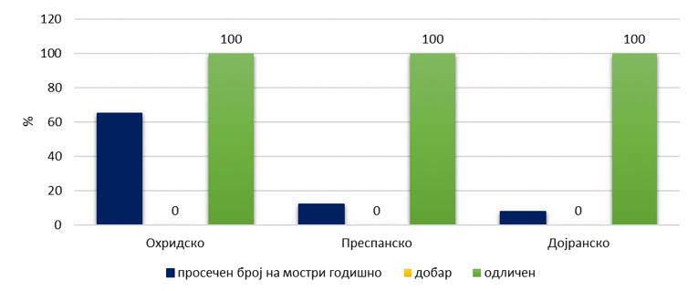 Во испитуваниот период водите на природните езера кои се користат за капење покажале одличен квалитет согласно одредбите на Правилникот за начинот и мерките на управување со водите за капење, техничките китериуми и целите на квалитетот на водата за капење, како и начинот и постапката за информирање на јавноста за резултатите од мониторингот на водата за капење (Граф.1) („Сл. весник на РМ“ бр.129/16).