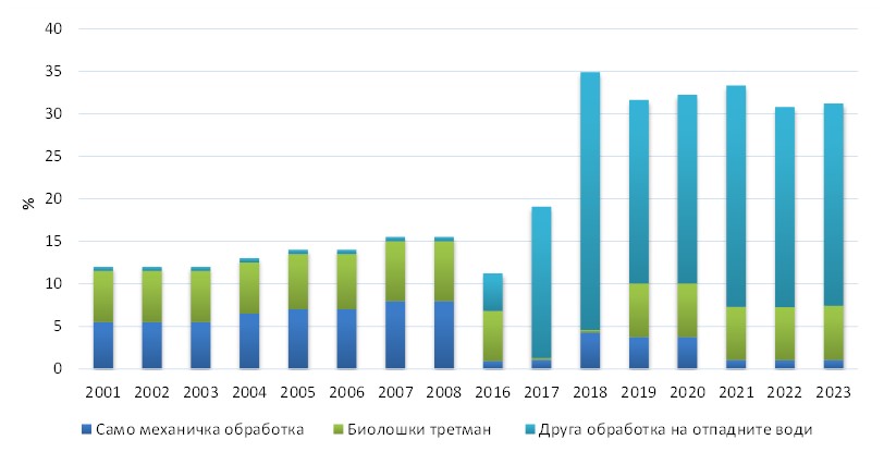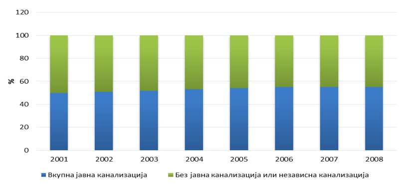 Во согласност со добиените резултати за дистрибуција на процентот на население во однос на третираните комунални води само со механичка обработка, биолошки третман и најнова технологија на третман и во однос на јавната канализација се утврди дека процентот на ваквото население е многу мал. Иако постои растечки тренд, ваквата состојба во однос на ЕУ барањата е незадоволителна.