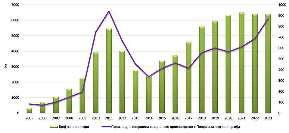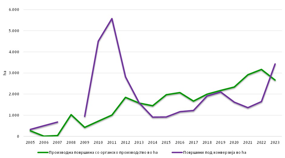 Во разгледуваниот период производните површини и површините под конверзија со органско производство имаат променлив тренд на пораст и опаѓање. Производните површини со органско производство имаат позитивен тренд на пораст од 11 пати, од 266 хектари во 2005 година на 2.664,08 хектари во 2023 година. Површините под конверзија имаат најголем пораст, од 17 пати, во периодот 2005 до 2011 година, а најголем пад во периодот од 2011 до 2014 година. Позитивен тренд на зголемување на површините под конверзија се јавува повторно од 2015 до 2023 година.