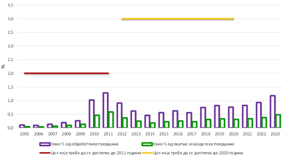 Истотака целта не е постигната и согласно проекциите дадени во националните стратегии за земјоделство и рурален развој 2014-2020 и 2021-2027 година. И покрај зголемувањето на производните капацитети за органско производство во изминатиот период посакуваните проекции на политиката за удел на обработените површини под органското производство се под 2% од вкупното обработено земјоделско земјиште во Република Северна Македонија.