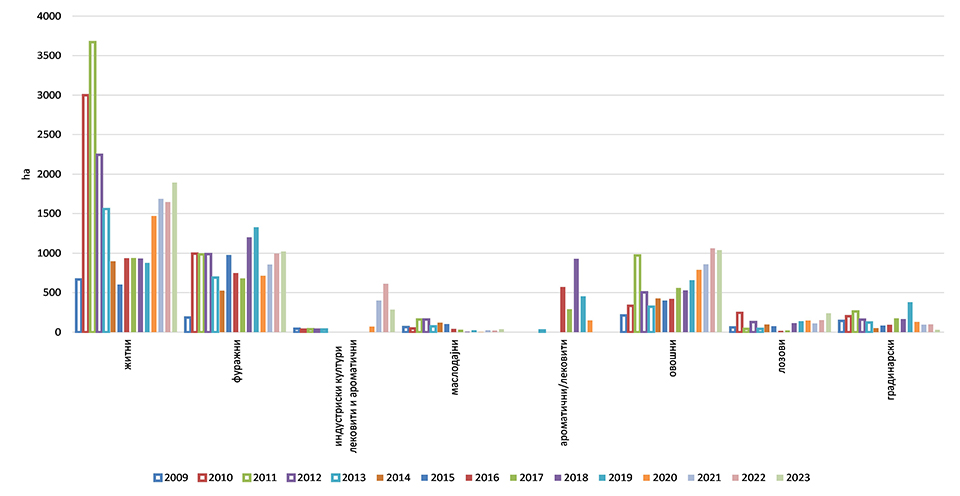Производните површини со органско производство имаат позитивен тренд на пораст од 11 пати, од 266 хектари во 2005 година на 2.664,08 хектари во 2023 година.