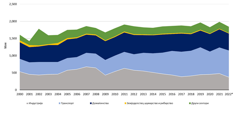 Во периодот од 2000 до 2022 година, Финалната енергетска потрошувачка во Република Северна Македонија е зголемена за 14,5%. Споребено со 2021 година, таа е намалена за 7,3 %, како резултат на нејзиното намалување во секторот домаќинства и секторот земјоделие. Ова може да се забележи од следниот графикон на кој е прикажана потрошувачка на финална енергија по сектор за период 2000-2022 година. Најголем удел се забележува во секторот транспорт што се должи на зголемениот број на возила, по што следата домаќинствата и индустријата. Финалната потрошувачка на енергија остана стабилна со малку варијации, главно поради флуктуација на потрошувачката во индустријата, зголемена потрошувачка на горива во транспортниот сектор и Covid кризата 2020-2021 година. Падот на финалната потрошувачка во 2009 и 2017 година главно е резултат на прекинот на производството на некои инсталации како Југохром заради остварување на обврските од воспоставена еколошка политика за индустриски инсталации (усогласување со оперативниот план од А-ИСКЗ дозволите). Во 2022 година во споредба со 2021 година се намалува финалната енергетска потрошувачка за 9 проценти заради намалена потрошувачкиво сите сектори со исклучок на транспортот.