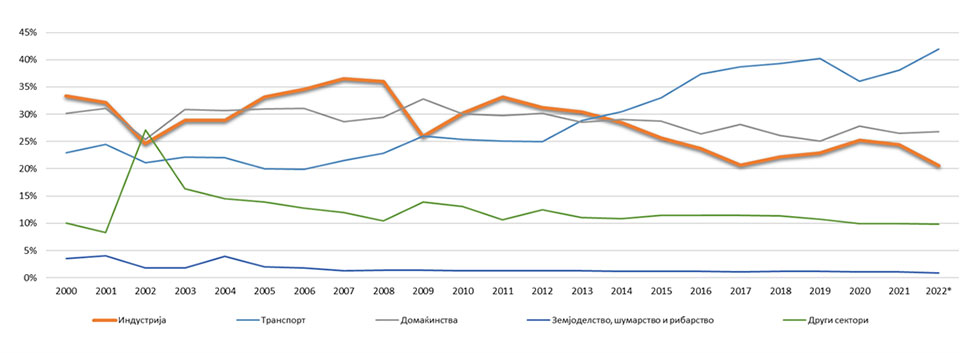 Секторот транспорт во финалната потрошувачка на енергија генерално има растечки тренд кој е особено изразен од 2012 до 2022 година (историскиот максимум од овој сектор е во измината година 2022 година со удел од 42%). Секторот индустрија во целиот период 2000-2022 година покажува променлив тренд со историски минимум во уделот во 2017 година од 20,7% што може да се должи на затварање на инсталација за производство на феролегури Југохром по што и во следните години не покажува значителни промени (во 2022 година има удел од 20,5%). Секторот домаќинства во периодот 2000-2022 година генерално покажува променлив тренд, со максимален удел во 2012 година од 30,1%.