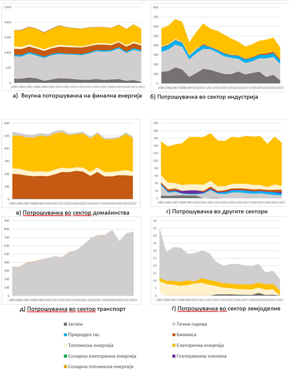 На следните графици се прикажани трендовите на потрошувачката на финална енергија по одделни сектори и гориво за период 2005-2022 година (согласно расположливите податоци), со цел да се направи подетална анализа на трендовите и особено на клучните сектори во потрошувачката на финална енергија.