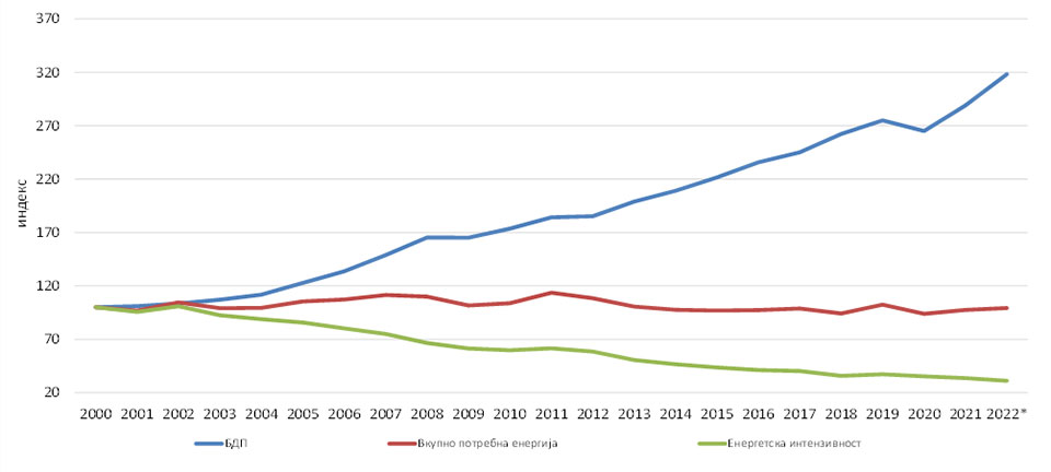 Во периодот 2000-2022 година може да се забележи генерално поволен тренд на намалување на eнергетската интензивност.Имено, доаѓа до раздвојување на економскиот интензитет од БДП, затоа што растењето на вкупно потребната енергија се одвива поспоро од растењето на БДП. Во 2022 година споредбено со 2021 година имаме раст на БДП од 10 % изразени во милиони евра, и раст на вкупно потребна енергија од 2%. Како што БДП расте повеќе од вкупно потребната енергија, така енергетскиот интензитет опаѓа. Трендот на се поголемо раздојување на овие параметри се должи на се поголема употреба на еколошки горива и обновливи извори на енергија, но и помал потрошувачка на вкупната енергија особено во домаќинствата поради климатските промени и се потоплите зими. Од другa страна излезот од енергетскатаи COVID кризата во 2022 година доведуваат со значително зголемување на БДП споредбено со 2021 година.