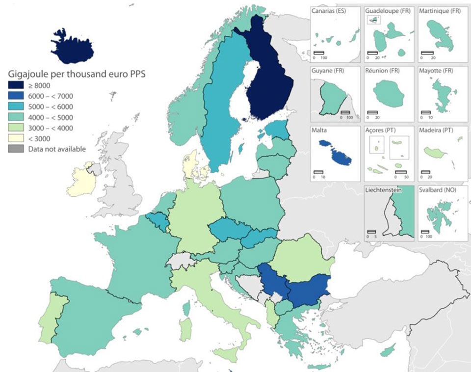 Од анализираните потаоци на ЕУРОСТАТ може да се забечежи дека највисока вреднсот на енергетски интензитет на економијата има Исланд со 17 737.3 GJ/1000 EURO PSP, а нашата земја се одликува со вредност од 4465 GJ/1000 EURO PSP. Исланд се одликува и со најголем удел на обновливи извори во енергијата од 83% во 2021, односно 85% во 2022 година.