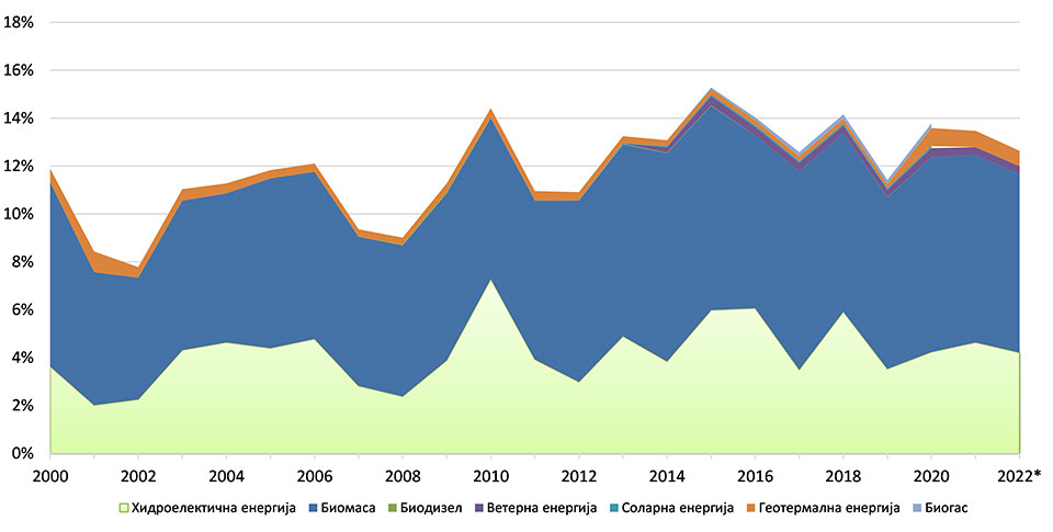 Релативно нискиот удел на обновливата енергија во вкупната потрошувачка на енергија (во просек 11,8%) укажува на доминантна употреба на фосилни горива што е неповолно и од аспект на исцрпување на енергетските ресурси и од аспект на загадувањето на околината. Најголем удел на обновливата енергија во вкупната потрошувачка на енергија имало во 2015 година со 15,3%, а најмал со 7,8% во 2002 година. На следната слика е прикажано учеството на ОИЕ по вид на енергети.
