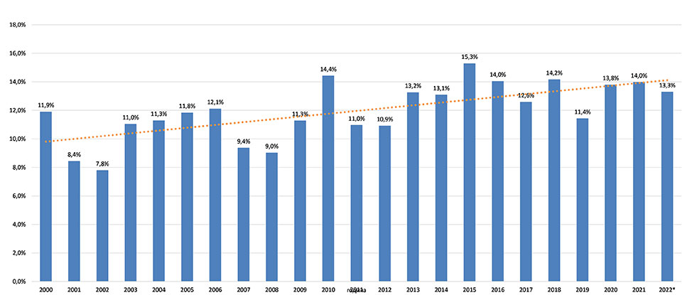 Слика 2. Вкупно учество на обновливата енергија во вкупно потребната енергија (%) по години во периодот 2000 – 2022 година