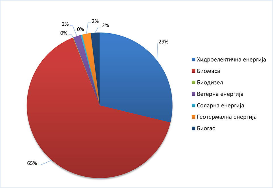 Најголем удел во учеството на обновливата енергија во вкупно потребната енергија имаат биомасата со удел помеѓу 5,1% и 8,7% и хидроелектричната енергија со удел кој се движи од 2% до 7,3%. Енергијата од ветерот, сончевата енергија, биодизелот, биогасот и геотермалната енергија имаат значително помал удел во вкупната потребна енергија.