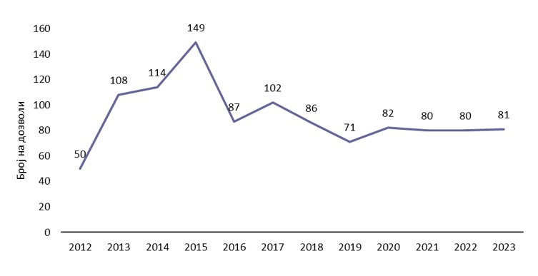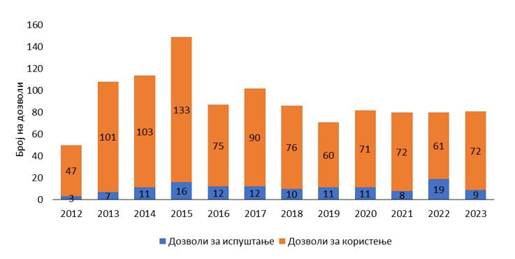Во разгледуваниот период од 2012 до 2023 година, издадени се вкупно 1090 дозволи за води, од кои 129 дозволи за испуштање во води и 961 дозволи за користење на вода. Најголем број на издадени дозволи има во 2015 година, 16 дозволи за испуштање во води и 133 дозволи за користење на вода. Бројот на издадени дозволи има тренд на опаѓање во периодот од 2016 до 2019 година, по што се следи благ пораст, што е очекувано согласно утврдениот рок на важност.