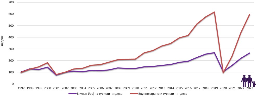 Туристичката посетеност на странските туристи е дадена во временска серија од 1997 год., но поради конзистентност на анализите периодот од 2002 до 2023 год. овозможува соодветно согледување на движењата. Обемот и динамика на странската посетеност го изразува развојот преку апсолутни бројки и базниот индекс. Споредбено, тоа е однос спрема почетната година од анализираниот период. Тој ги опфаќа вкупниот и бројот на странски туристи кои ја посетиле РСМ по години од 2002 до 2023 год. Бројот на странски туристи бележи рапидно зголемување во сите анализирани години во однос на базната 2002 год.