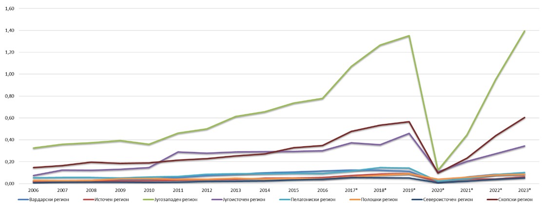 Во последните десет години до пандемијата порастот е присутен во сите региони во континуитет. Најголем пораст до 2019 год. е забележан и во СКР и во ЈЗР иако и онака имаат најголема концентрација на странски туристи. Но, трендот на зголемување на бројот на странски туристи дава порака која води кон поизбалансирано движење на странската туристичка клиентела по планските региони. Најдинамична е посетата на СИР со пораст од 251, 55 % во 2019 год., кој иако намален во однос на 2017 год.( 271.43 бода) претставува најголем пораст.