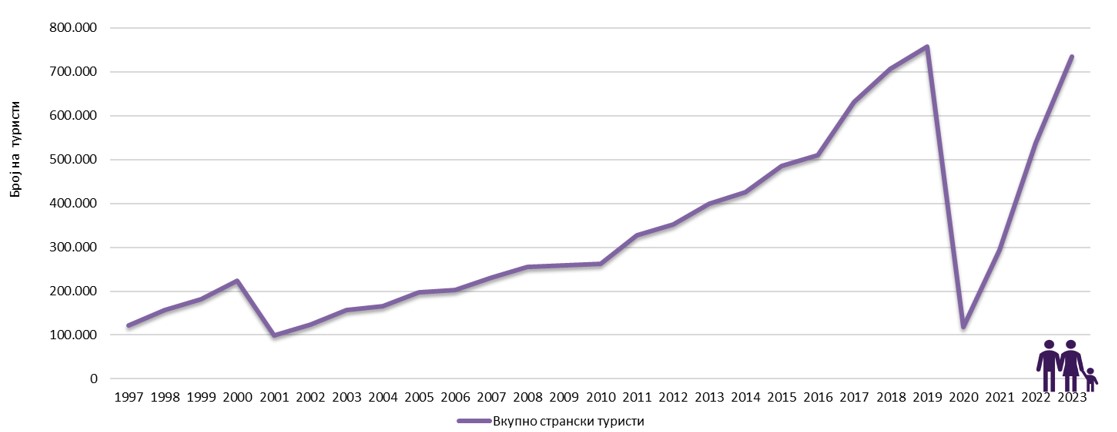 Бројот на странски туристи кој во 2002 год изнесуваа 122.861, во 2012 година или во првиот десетгодишен период се покачува на 351.359, односно бележи индекс на пораст од 285,98. Оваа динамика е уште по изразена во периодот до пандемијата Ковид 19. Во 2019 година остварена е највисока посета во овој анализиран период од 757.593 странски туристи, што значи зголемување во рамките на индекс 616.63 или зголемување за 516,63%. Драстичното намалување на странската посетеност во 2020 год. е очекувана последица на пандемијата која што ја зафати целата планета, од што не беше поштедена и РСМ. Индексот на посетеност се намалува под нивото на базната 2002 год., и изнесува 96.21. Пост ковидскиот период е карактеристичен по благото покачување на посетеноста во 2021 год., а во 2023 год. индексот на раст изнесува 598 што претставува забележителна тенденција и во наредниот период. Тоа упатува порака дека интензитетот по овој основ ќе расте. Ваквиот рапиден пораст подразбира и соодветно користење на ресурсите на животната средина за да се амортизира притисокот што се очекува. Тоа значи дека е неопходно капацитетите во рецептивата која подразбира угостителска структура, инфраструктура, комунална уреденост и опременост и супраструктура да се приспособат кон динамичната туристичка побарувачка во опфатот на животната средина како туристичка дестинација.