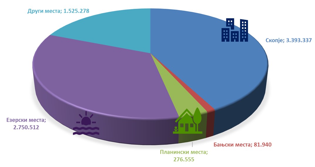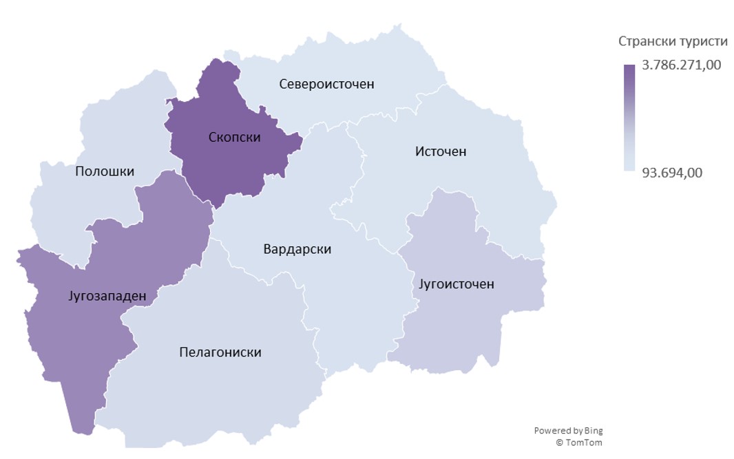 Најголем обем и учество е забележано во Скопскиот и Југозападниот регион. Најмал а е посетеност и учеството на странските туристи во СИР и ИР.