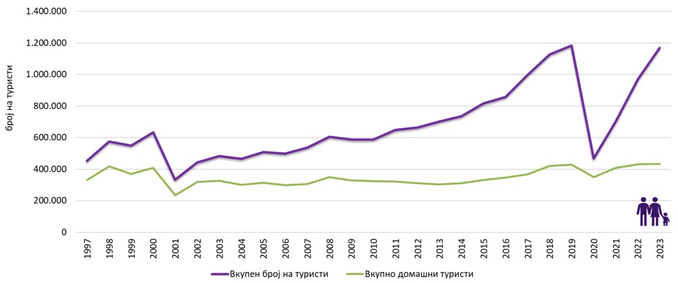 Туристичката посетеност на домашните туристи во периодот од 2002 до 2023 год. бележи нестабилност во обемот и динамиката. Периоди на намалување на бројот, во однос на базната 2002 год. се јавуваат од 2003 до 2007 год.и од 2011 до 2014 год. Релативно забележителен пораст се јавува од 2015 до 2019 год. значи до пандемијата Ковид 19. Во 2019 год. индексот на зголемување во однос на базната 2002 година изнесува 134 или пораст од 34%. Во периодот од 2021 до 2023 год. доаѓа до повторно, позабележително зголемување на бројот на домашни туристи. Порастот во 2023 година во однос на 2019 година изнесува 1,2%, а во однос на базната 2002 година, 36,6%. Покрај нестабилноста во остварениот број на доаѓања на домашните туристи, сепак тоа зборува за позитивен тренд во зголемувањето на посетеноста што ќе се одрази на интензитетот на туризмот во животната средина.