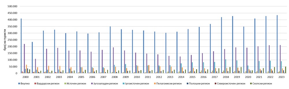 График 4. Доаѓања на домашни туристи според статистички региони во период 2000 – 2023, вкупно