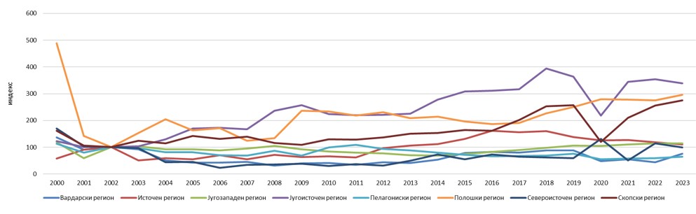 Трендот на зголемување во постковидскиот период, 2023 во однос на 2020 година, и понатака е присутен во ЈЗПР (9,9%), иако динамиката на поголем раст е присутна и кај Скопскиот (129,7%) и Југоисточниот плански регион (55,33%). Ова упатува на очекуван пораст на бројот на домашни туристи и во другите плански региони, односно порамномерна дистрибуција на овој вид промет.