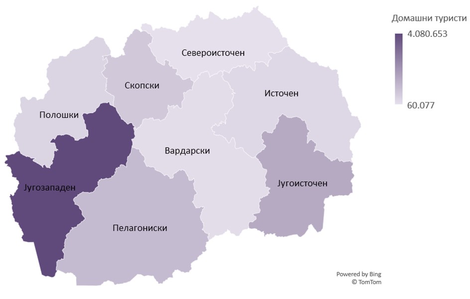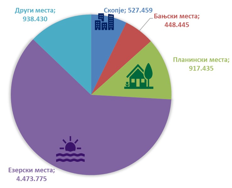 Очигледно е дека најголем број на домашни туристи ги посетиле езерските места. Следат планинските и други места, а најмалку се посетени бањските места и Скопје.