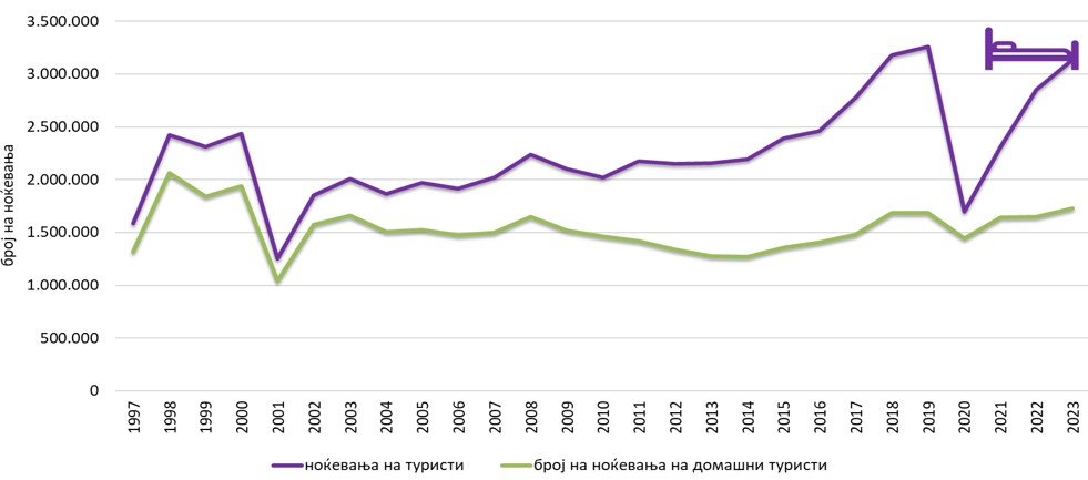 Обемот на остварените домашни ноќевања во 2023 год. изнесува 1.728.469 ноќевања. Тоа значи дека неговото учество во вкупниот број од 3.135.767 остварен во РСМ е преовладителен и изнесува 55,5%. Тоа се однесува и на останатите анализирани години во овој дваесетгодишен период. Значи дека овој интензитет врз животната средина е и најголем. Сепак,  динамиката покажува движења кои имаат побалансирани карактеристики.