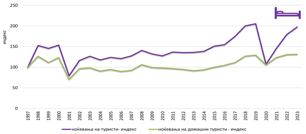 Динамиката на обемот на остварени ноќевања на домашните туристи во РСМ и Планските региони пресметана е со користење на базните индекси. Индексите се споредлива вредност изразена во бодови. Тие ја изразуваат релативната големина на бројот на ноќевања домашни туристи во тековниот период спрема  бројот на ноќевања на домашните туристи регистрирани во базниот период. Како базен индекс на временската низа земена е почетната година како карактеристична година на развојот на туристичкиот промет. Базните индекси ги добиваме  според следнава формула: