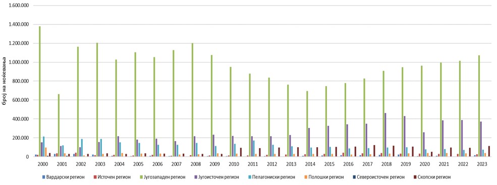 Од расположливите податоци се забележува дека најголем број и учество на реализирани ноќевања на домашните туристи има ЈЗПР. Бројот во 2023 год достигнува 1.073.550, односно учество во вкупниот број на ноѓевања во земјата од 64,5%. На второ место по овој вид на туристички промет е ЈИПР во кој, во последната анализирана година се остварени 373.851 ноќевања на домашните туристи. Другите региони во овој поглед забележително заостануваат.  Најмал обем на престој СИПР од 4.975 ноќевања, што има симболичен карактер во однос другите региони. Клучна порака е дека постои изразито остварување на ноќевањата на домашните туристи во ЈЗПР и регионите во кои половите на развој се покрај езерските крајбрежја. Тоа е порака дека бројот на ноќевања има јасна концентрација и дека во овие региони е и најголемиот притисок по овој основ. Динамиката на бројот  на ноќевања на домашни туристи по регион ги покажува развојните карактеристики на туризмот. Таа е во функција да ги определи планските идни  претпоставки.