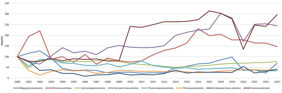 График 6. Ноќевања на домашни туристи според статистички региони во период 2000 – 2023