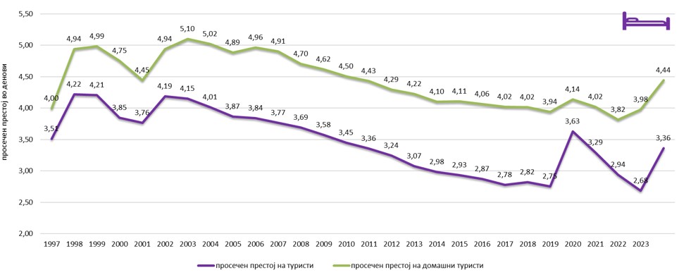 Престојот на туристите е во тесна врска со задоволувањето на туристичките потреби и потрошувачката која е неопходна за да се реализира. Тој зависи од динамиката на посета и слободните финансиски средства, но и од рецептивните капацитети како по обем, така по квалитет на стоки и услуги. Развојот на домашниот туризам се определува со престој на домашни туристи, односно со реализираните ноќевања на оваа структурна категорија туристи. Тој зависи од националниот доход, семејниот буџет на населението и личните примања. Остварените ноќевања од страна на домашните туристи се индикатор за прифатливоста на домашната туристичка понуда. Престојот на домашните туристи во обем и динамика треба да се анализира преку реализираните ноќевања во периодот од 2002 до 2023 год.