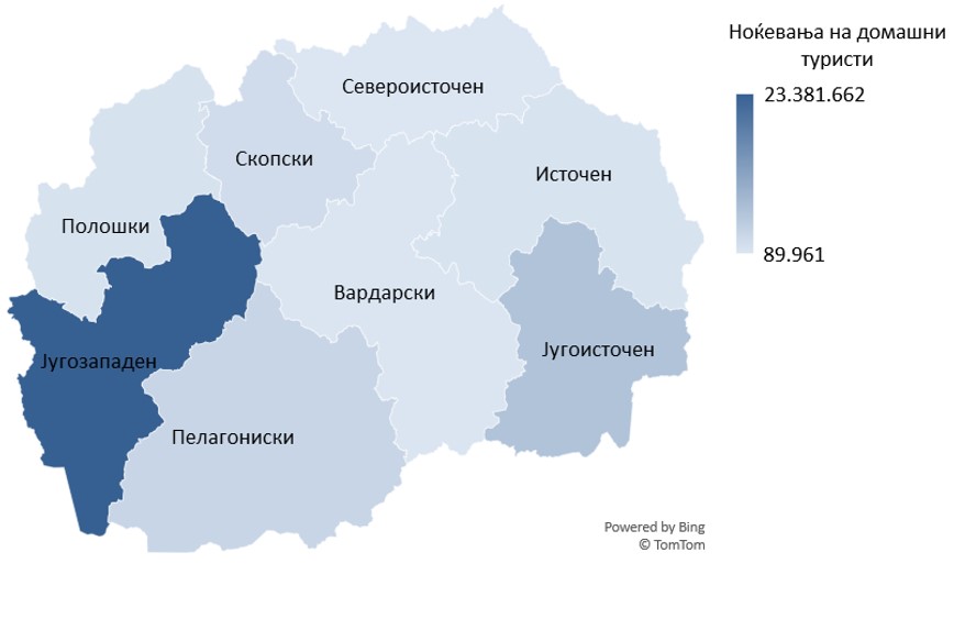 Број на ноќевања на домашни туристи има нерамномерна дистрибуција по региони. Анализата треба да покаже кои региони имаат најголема концентрација на реализирани ноќевања. Така ќе се согледа и интензитетот на овој вид туристички промет врз животната средина во регионални рамки.
