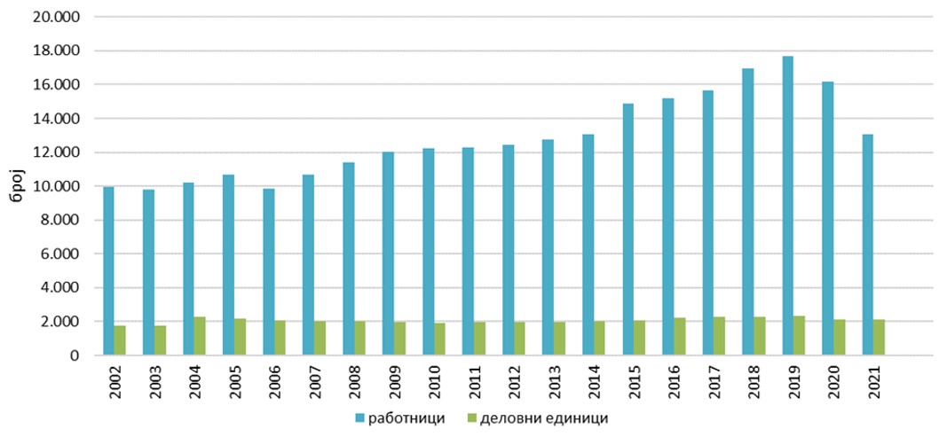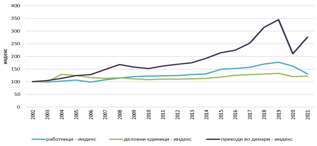На следните графикони прикажани се Обем и динамика на бројот на работници, деловни единици и приходи, за период 2002 до 2021 година, додека не се достапни податоци за 2022.