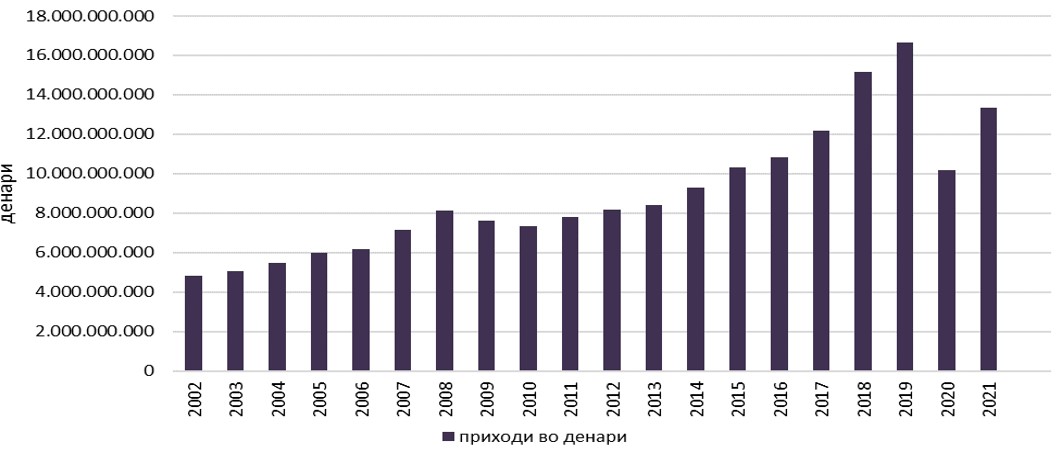 Остварените приходи во сите години од анализираниот период, во однос на базната 2002 год. бележат позитивен обем и динамика. Тие се со изразито импресивни карактеристики. Приходите во 2019 год. се зголемиле, дури за три и пол пати. Ваквата динамика има изразито позитивно дејство во економијата на РСМ.