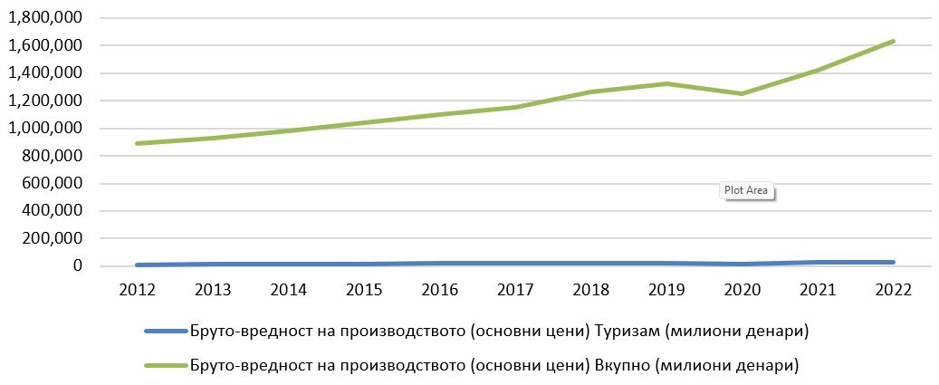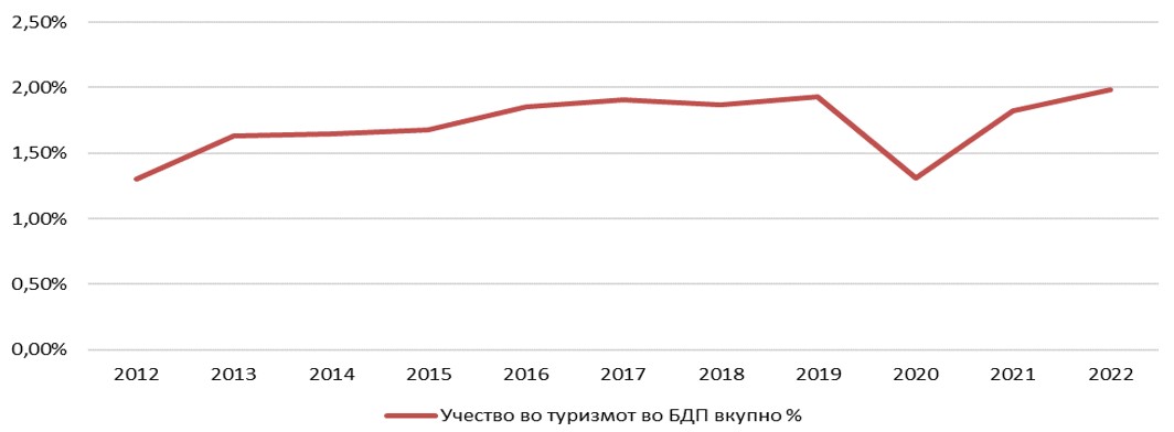 Учеството на туризмот во бруто домашниот производ покажува дека бил највисок во 2019 год. кога изнесува 2,38%. Остварениот БДП во милиони од туризмот изнесува 31.451,58, а БДП на ниво на државата 1.320.895,53.