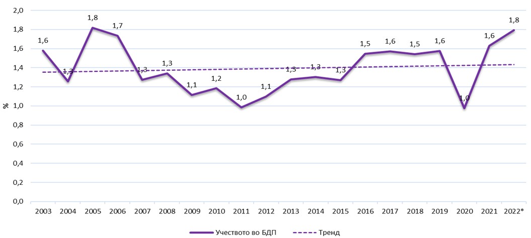 Графикон 7. Динамика на процентуално учеството на туризмот во БДП