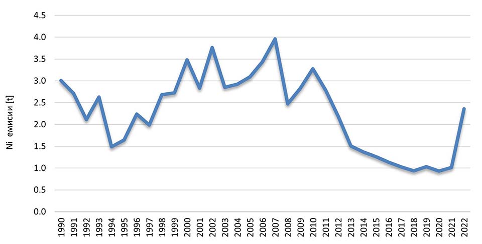 Во 1990 година вкупните национални емисии на Ni изнесуваа 3.01 t. Во 2022 година емисиите изнесуваат 2.36 t и се намалени за 22% споредено со 1990 година што претставува одреден напредок во намалувањето на вкупните емисии на никел.