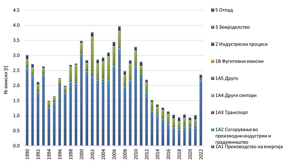 Може да се забележи дека во 2022 година, клучен извор на емисии на никел е NFR категоријата 1.А.1 - Производство на енергија со удел од 90.0% во вкупните годишни емисии на Ni.