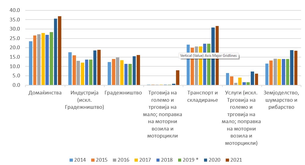Во периодот што е предмет на анализа (2014-2021), се забележува дека најголем удел во приходите прибрани врз основа на енергетските даноци од аспект на секторот на плаќање имаат домаќинствата т.е. 23,5 % во 2014 година и 36,8 % во 2021 (Графикон 1).[1] Потоа следуваат транспортот и складирањето (21,6 - 31,7 %), индустријата (без градежништво) со 17,5 - 18,9 % учество, градежништвото (12,3 - 16,1 %), потоа земјоделството, шумарството и рибарството (11,5 - 18,4 %), па услугите (исклучени се трговијата на големо и трговијата на мало и поправката на моторни возила и моторцикли) со 6,5 - 6,1 %), а со најмал удел е секторот трговија на големо и трговија на мало и поправката на моторни возила и моторцикли (0,3 - 8,0 %).