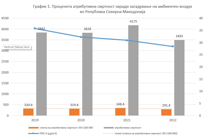 Проценетата атрибутивна смртност која се припишува на загадувањето на амбиентниот воздух во Република Северна Македонија во 2022 година се движела од 2 345 до 4 507, и стапка во ранг од 195.6 до 376.0 смртни случаи на 100 000 жители за анализираниот период 2020-2022. Проценките се изведени со податоци за движење на население од последниот Попис 2021 за број на резидентно население, спроведен од Државниот завод за статистика. Покрај трендот на пад на годишните концентрации на PM2.5 честичките, се забележува благ пад на проценетата атрибутивна смртност.