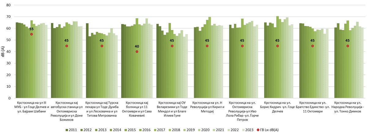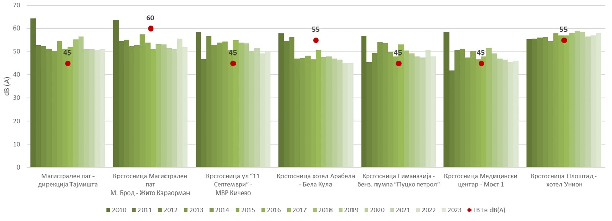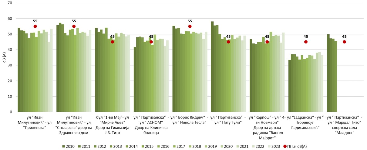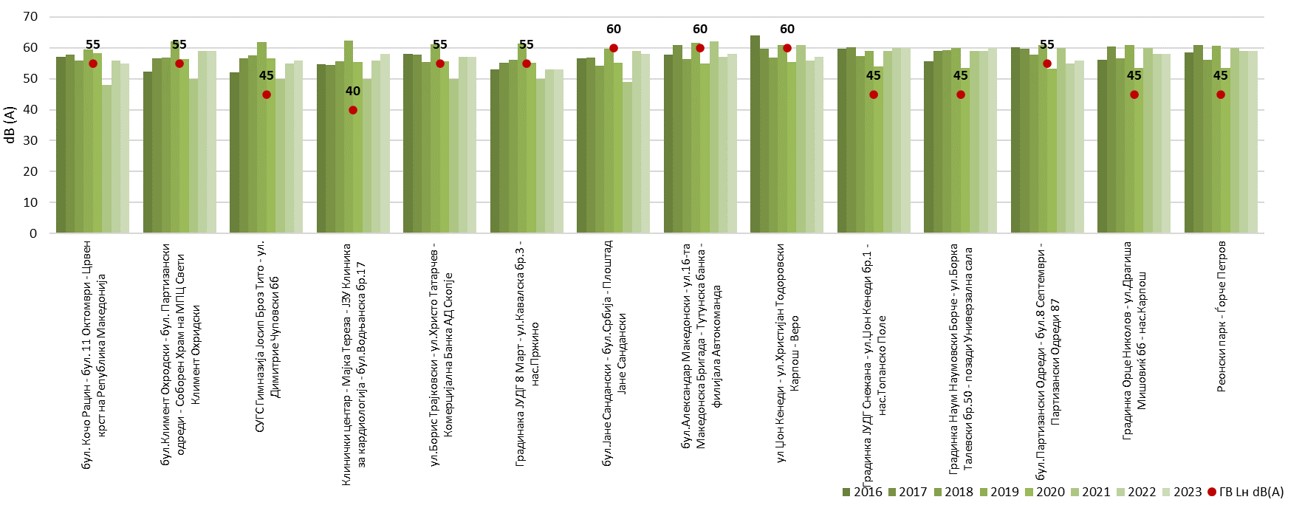 Од обработените податоци, на слика 1, може да се забележи дека во целиот разгледуван период, од вкупно 14 мерни места, интензитетот на комуналната бучава во животната средина во Скопје, за основниот индикатор Lн, на тринаесет мерни места е над ГВ, со значително покачување на индикаторот преку ноќта и се движи помеѓу најниско – 0,08 dB(A) и највисоко - 22,4 dB(A).