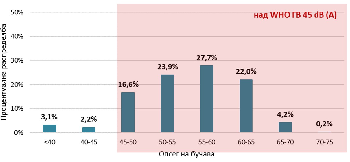 Исто така, споредено со препорачаната цел на Светската здравствена организација, интензитетот на бучава преку ноќ да не ја надмине вредноста од 45 dB (A), може да се заклучи дека овој процент е многу мал и изнесува 5,3%, што укажува на тоа дека интензитетот на бучава кој ја надминува вредноста од 45 dB (A) е доста висок и изнесува 94,7%.