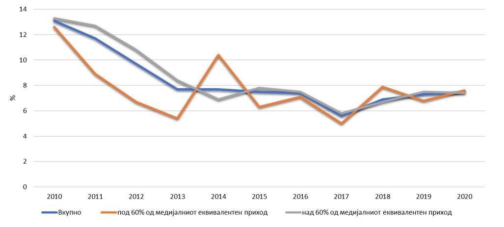 Трендот на опаѓање во разгледуваниот период кај сиромашната популација изнесува 39,7%, односно од 12,6% во 2010, паднал на 7,6% во 2020 година, што најверојатно се должи на поголем праг на толеранција.
