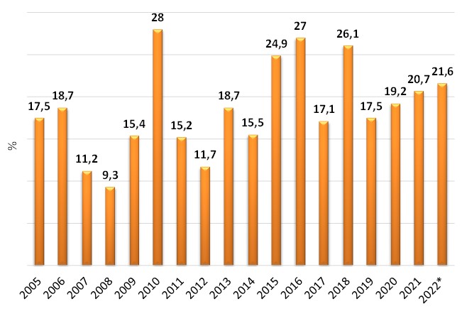Во 2022 година, уделот на потрошена електрична енергија произведена од обновливите извори во бруто-потрошувачката на електрична енергија изнесува 21,6% и е поголем со оној во 2005 година за 5%. И покрај тоа што се забележува напредок во учеството на обновливите извори во бруто-потрошувачката на електрична енергија во 2022 година во однос на 2005 година, кај овој индикатор видливо е уназадување споредено со 2018 година кога учеството на обновливите извори во бруто-потрошувачката на електрична енергија изнесуваше 26,1%.
